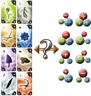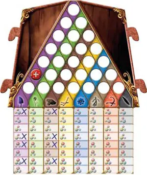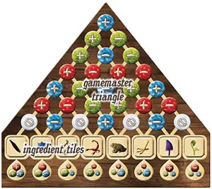 The gamemaster mixes up the 8 ingredient tiles and inserts them secretly and randomly into the 8 slots. The gamemaster does not need to worry about the actual alchemicals. The result of mixing any two ingredients is given by the triangle.