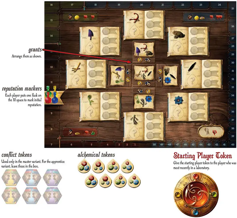 You can play Alchemists either as masters or apprentices. For your first game, we recommend you play the apprentice variant. A few of the rules are simpler, and the academic conferences are more forgiving. Even so, it offers the full range of possibilities.