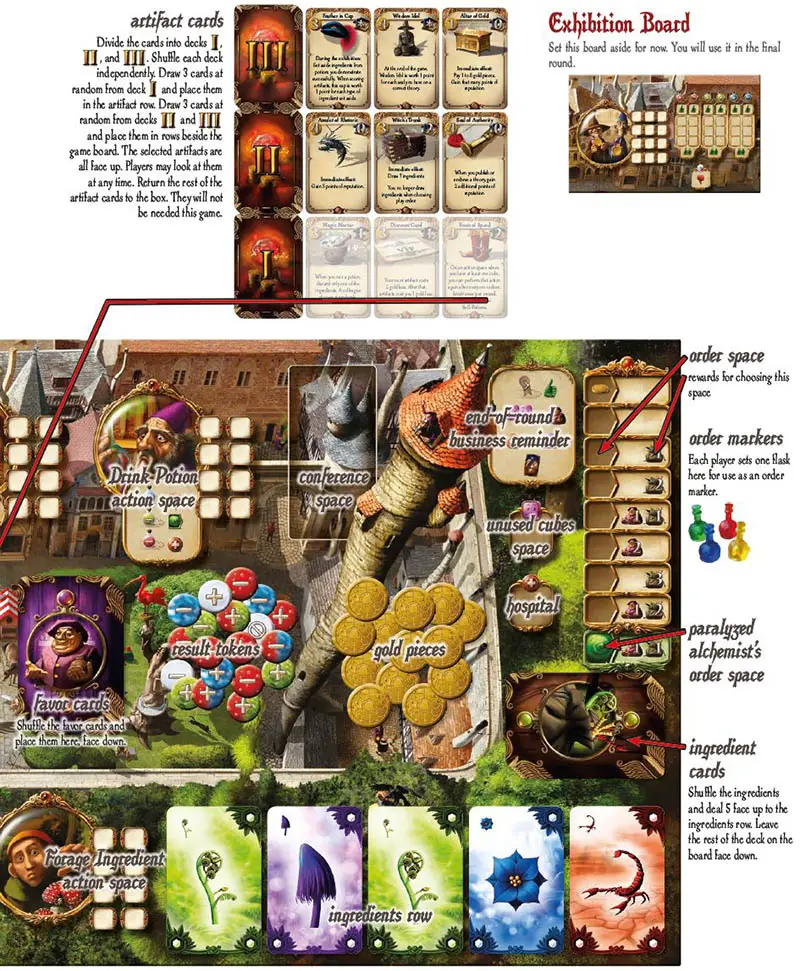 When setting up for the final round, place the exhibition board over the Test on Student and Drink Potion action spaces. They will be replaced by the Exhibit Potion action space. Select