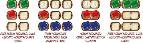 Place your action cubes on the actions you want to take this round. Different spaces have different requirements as illustrated below.