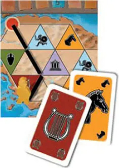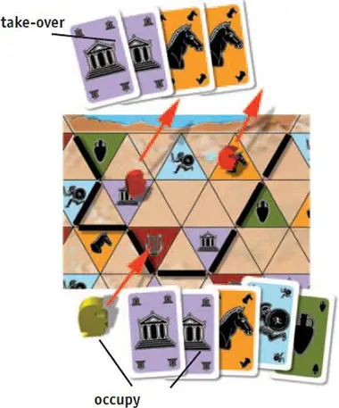 Then, he places 1 yellow guard on a lyre space and plays cards matching the other symbol spaces in the province: 2 temple cards, horse card, soldier card, and amphora card.