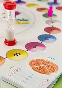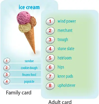 Adult cards have eight numbered words each on them. The spaces on the game board have the same numbers, so the location of your pawn determines the number you should explain.