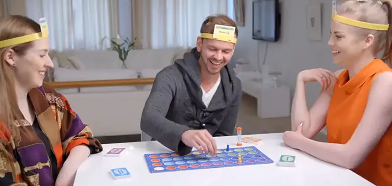 The guesser removes that character card from their headband and places it in a separate face down pile in front of themselves. Each face down card counts as a minus point for that player at the end of the round. Now the explainer starts to explain a word to the next player clockwise.