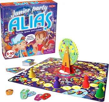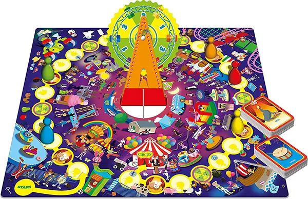 The game board contains all the images that appear on the word cards and acting cards, you can listen to how the player in turn describes the image on the card, or how they imitate it, and search for it around the fun fair!