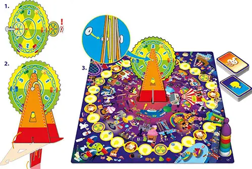 Assemble the Ferris wheel (1, 2) and place it in the middle of the game board, as in the picture 3.