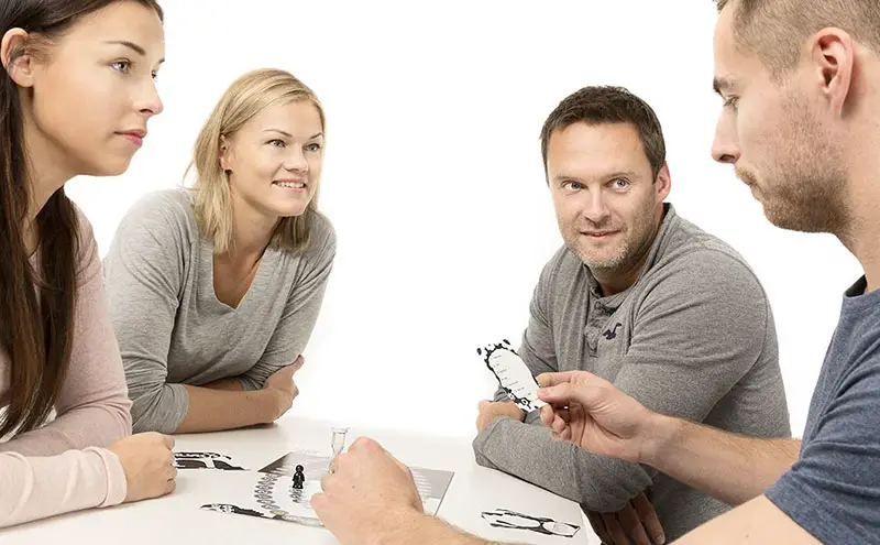 The men form one team, and the women the other! Both teams will try to be the first to reach the finish space by explaining and guessing words correctly.