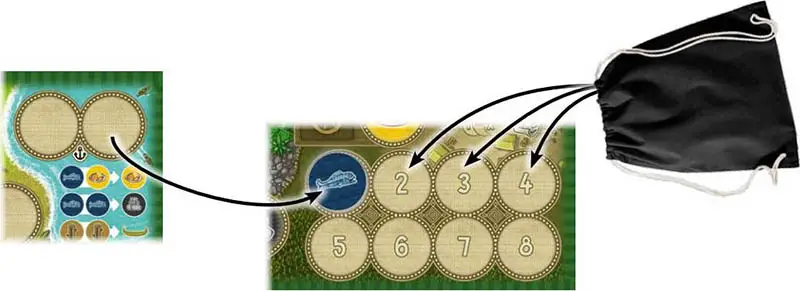 Put all tiles you are removing to take an action, along with any tiles gained by taking the action, into your container. The same applies to food tiles used for movement. (Remember: Tiles in your container will remain there until you need to draw from your bag and it is empty). When you gain a new tile, take it from the corresponding location tile.
