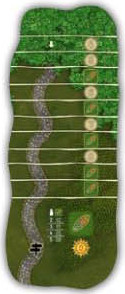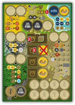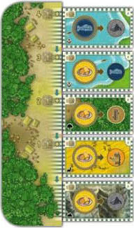 Moving by Cart: Each player begins the game with 1 cart (but may buy more). You can use each cart once per round. A cart allows your player pawn to move up to 3 steps around the plateau (instead of 1) , in either direction. When you use a cart, slide it to the right to indicate that it cannot be used again this round. You can use your first cart each round for free, but for each subsequent cart you use in a round, you must have 1 food on your movement action spaces.