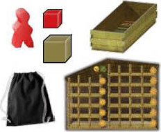 Each player chooses a color and receives the following personal items: 1 action board, 1 warehouse, 1 player pawn, 1 road marker, 1 container, 1 cart (from the village) , and 1 cloth bag.