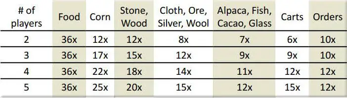 - Determine how many goods and carts to use, based on the number of players (see chart below) , returning any extras to the box.