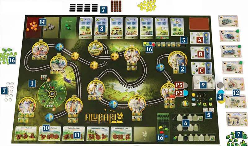 In Alubari, players compete to cultivate and harvest their own Tea Estates and assist in the building of the Darjeeling and Himalayan Railway, from Siliguri Town to 'the summit' at Darjeeling.