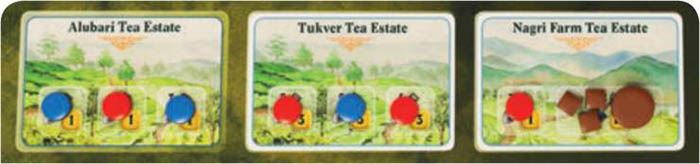 Note: if you have made use of Contract cards 28 and/or 29 to 'borrow' one or more game-owned Tea Estate spaces during the game, remove your markers from those spaces before scoring.
