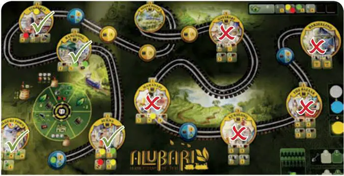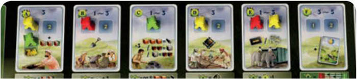 6 Take the 3 black discs and place one on each of the starting spaces of the Excavation Work rate, Lay Track Work rate, and Crop Harvest Work rate tracks (indicated by a darker green).