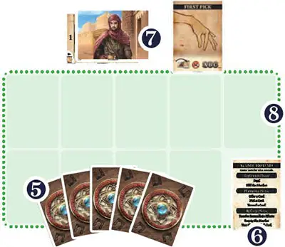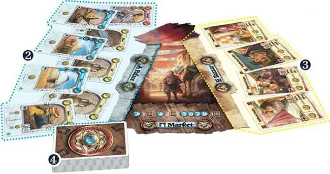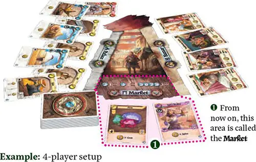 3 Set up the Bazaar by placing each Bazaar card faceup next to the Bazaar side of the Game Board.