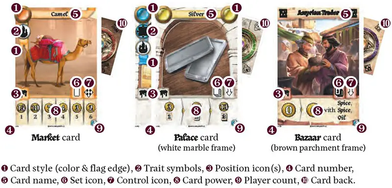 Depending on the card played, its effect allows the player to take a card either from the Palace, the Bazaar, or the Market (see the Card Reference booklet for further details). Effects are the only way of acquiring Palace and Bazaar cards.
