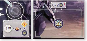 In pre-Impact Eras, the Chronobot always powers up 6 Exosuits, while in post-Impact Eras, it powers up 4. The Chronobot neither gains nor spends Energy Cores. Powered up Exosuit markers are piled on top of each other on the upper right Hex-shaped slot.