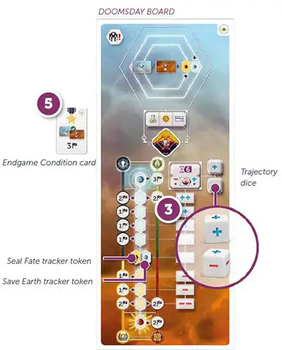 3 Place the Doomsday board next to the Main board. Treat this as part of the Main board. Place the Trajectory dice on the designated slots on this board, and the Save Earth and Seal Fate tracker tokens on their respective starting positions on the Doomsday Track.