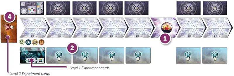 After flipping the Superproject above the following Era's Timeline tile, also flip the face-down Level 1 Experiment card below it. Then, place a face-up Level 2 Experiment card from the top of the stack below each Timeline with no Experiment card below it.