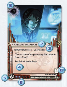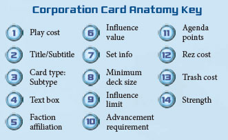 The Corporation identity card defines the Corporation's faction and describes the identity's special ability. It also provides a minimum deck size that must be observed when deckbuilding 8 and the amount of influence available for spending on outof-faction cards 9.