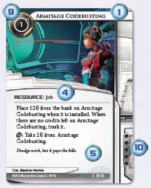 The Corporation pays credits equal to the play cost 1 of an operation to play it. When played, an operation's abilities as listed in its text box 4 are resolved. Then, the operation is immediately trashed. Operations are never installed.