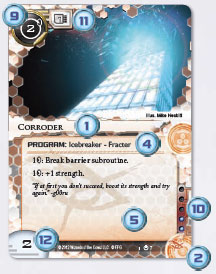 A piece of ice has one or more subroutines | in its text box 4 that the Runner must break during a run or suffer their effects (see "Ice" on page 16) if the ice is rezzed.
