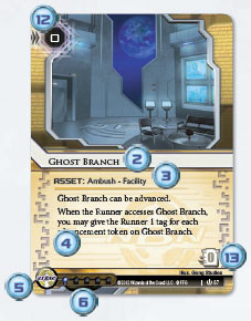 Assets provide the Corporation with resources and connections that help him advance and score his agendas. The Corporation installs assets in remote servers. An asset is not active until it is rezzed by paying credits equal to its rez cost (12).