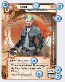 The Runner identity card defines the Runner's faction and describes the identity's special ability. It also provides a minimum deck size that must be observed when constructing a deck 6, and the amount of influence available for spending on out-of-faction cards 7. See "Deckbuilding" on page 24 for more information.