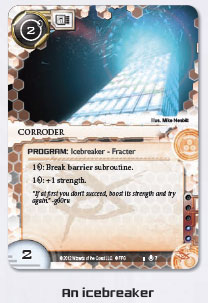 Icebreakers are programs with the icebreaker subtype that the Runner can use to overcome ice encountered during a run. Each icebreaker has a strength, an install cost, and one or more subtypes that reflect which kind of ice subroutine it is designed to break.
