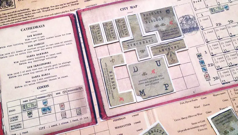 Each player may build any of the buildings listed on the player aid. Most buildings can be built only once per player. Exceptions are Stores, Cart Shops, Fountains, and Houses. A Cathedral can be rebuilt only if it has been razed (by the Faculty of Theology). Other buildings can never be rebuilt, not even if the original building has been incapacitated by graves.