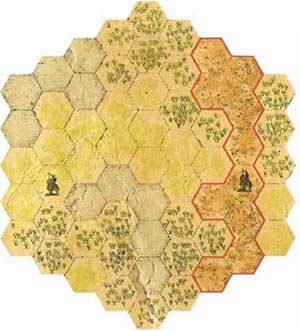 The Lyon player has manned his stables and therefore has a zone of control extending 3 steps. The Otter player has been encircled by the inns of the Lyon player: the Lyon player can reach ever}- hex the Otter player can reach.
