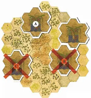 If the player builds an inn on the indicated place, the areas marked "C" (or "C" and "D" if he has a manned harbor) are added to his zone of control.