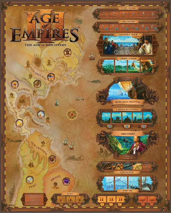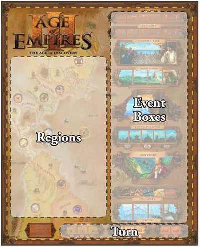 The map of the North and South American continents on the left side of the board is separated into 9 regions. Each region has a trade good associated with it (for example Peru has silver). On the right side of the board are the event boxes. During the game, players place their colonists in these boxes to perform different actions.