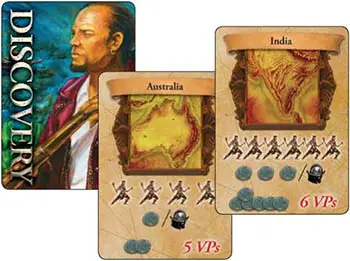 A successful Discovery Deck expedition rewards the player in exactly the same manner as the discovery counter with the following exception: The Discovery Deck consists of specific geographic locations (The Mississippi) or regions not on the game board (China); therefore no colonists are placed on the board as a result of a successful Discovery Deck expedition.