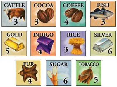 (gold x 5, silver x 6, cattle x 3, cocoa x 3, fish x 3, sugar x 6, fur x 4, coffee x 4, tobacco x 5, rice x 3, indigo x 4). These are used to represent the trade conducted by each Colonial Empire. The number on the counter shows the quantity of each trade good in the game.