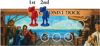 The next player to pass places her colonist in the next lowest available space (for example in a five player game, the first player to pass places his colonist in the "5" space and the next player to pass places her colonist in the "4" space).