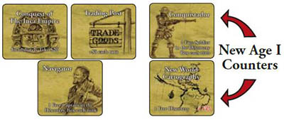 The Board: In each Region (except the Caribbean) place one random discovery counter face down. The Caribbean Region is available for colonization from the beginning of the game, and so does not need a discovery counter. In addition, place one trade good face up in each region.