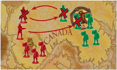 Battles occur in New Granada, New Spain, and Florida. No battle occurs in Canada. Although both players have colonists in Canada, neither of them have a soldier there.