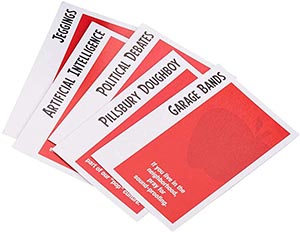 Players (except the judge) quickly choose the red apple card from their hand that is best described by the word on the green apple card played by the judge.