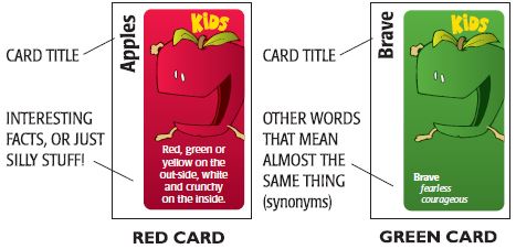 For a tart twist, choose and judge red apple cards that are the least like, or opposite, the word on the green apple card. For example, you might choose "Whales" when the word "Small" is played.