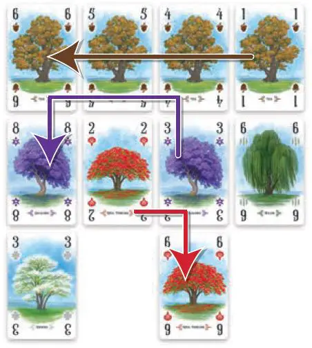 The player whose revealed cards have the highest sum for that species gains the right to score the single highest scoring path (i.e., not necessarily longest) of that species in their arboretum. In case of a tie for highest sum, all tied players gain the right to score their highest scoring path of that species.