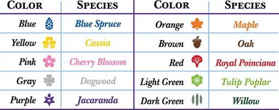 Jonte: Blue Spruce 4 (4), Cassia 6 (6), Jacaranda 7 (2+5), Maple 9 (4+5), Royal Poinciana 3 (3)
