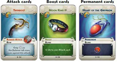 Permanent cards are never exhausted, so their ability is always at the disposal of the Hero who has it in his inventory. If a Hero decides to use a Permanent card's effect on an attack, he must declare it before rolling any dice.