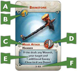All Attack cards are able to make either Melee or Ranged attacks, as indicated by the icons of their listed attack dice. While some Attack cards offer only a simple attack, many have some form of special effect listed which enhances their attack. This effect is only triggered when the card is used and the parameters stated in it are met.