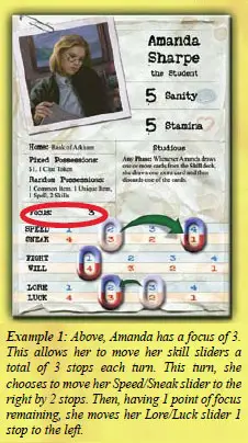 Finally, each player may adjust his investigator's skills using the three skill sliders he placed on his investigator sheet during game setup. This process, as well as a general description of how skill sliders work, is explained in the "Adjusting Skills" diagram.