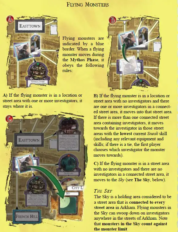 Flying (Blue Border): Flying monsters generally move directly towards the nearest investigator in a street area, or move to the "Sky" holding area if they can't reach any investigators this turn.