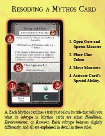 Finally, the first player looks at the special text on the Mythos card, examining the trait listed at the top of the card. The various traits indicate different types of Mythos cards.