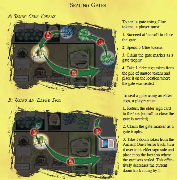 If an investigator successfully closes a gate, he may immediately spend five Clue tokens to permanently seal it. The player takes a doom token from the pile of unused doom tokens, turns it over to its elder sign side, and places the token on the gate location. The player still claims the gate marker as a trophy. The gate is now sealed: No further gates can open and no monsters can appear at the location of the sealed gate for the remainder of the game.