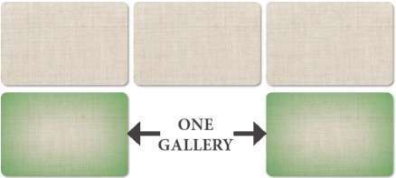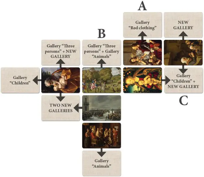 To open a new Gallery, the player must add the second Painting in the row/column. When placing the Painting on the table, the current player must announce the common feature for the Gallery to other players. From now on, Paintings may only be added to the Gallery if they match its feature. If a player opens two Galleries at the same time (horizontal and vertical one), they have to come up with two different features for each of those Galleries.