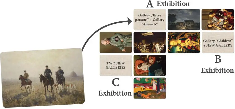 The feature of an already established Gallery may not be modified during the game and a feature already in use may not be repeated in another Gallery. Note: The more specifically the feature of a Gallery is defined, the more difficult it becomes for all players to add their Paintings there.