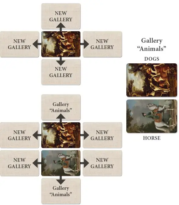 If a player plays a Painting showing a horse below the Starting Painting and announces the Gallery "Animals", then from now on, only paintings which also show animals may be added on both ends of this column. How- ever, to the right and to the left of these two Paintings, two new horizontal Galleries with different features may be opened.